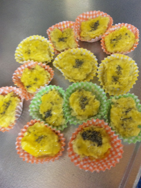 よく混ざったら お弁当用のおかずカップに適量入れて、黒ゴマを振りオーブンへ。