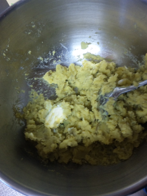 蒸しあがったサツマイモを熱い間につぶして、バター少々・牛乳・お砂糖少々を混ぜます。