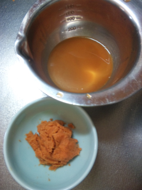 いつもと同じように卵黄と砂糖をすり混ぜてから、「人参のすったものと絞り汁」