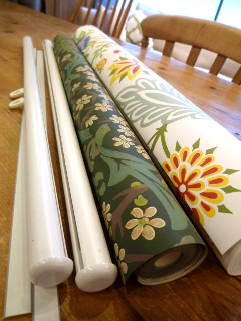 タペストリーパイプにテープを貼った輸入壁紙を差込み、キャップをかぶせる。